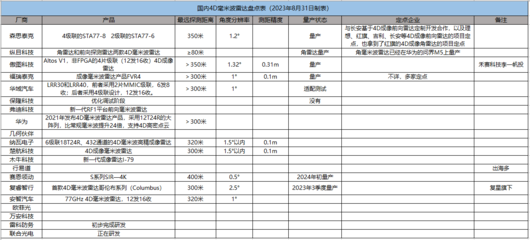 4D毫米波雷达的好处我们就不多说了,我们只要清楚地知道, 4D毫米波成像雷达的研发和应用并非一蹴而就的事,目前仍有许多技术难点需要不断优化和改进。从我们的表中也可以看到,能够量产4D毫米波雷达的,还是少数,多数还在研发阶段。