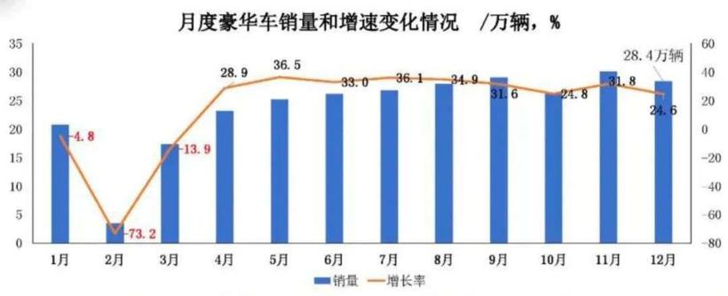 虽然疫情一度让车市陷入低谷,但豪华车市场“风景这边独好”。中汽协数据显示,2020年12月,国产豪华车销量达到28.4万辆,同比增长24.6%。2020年自4月以来,豪华车的涨势就没停歇,4-12月,其月度销量同比增幅平均达到31.4%。