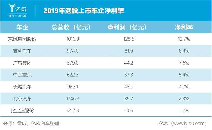 2005年,吉利在香港上市,长期股价在0.5港元左右徘徊,15年之后,截至8月14日收盘,吉利汽车股价为16.7港元,总市值为1558亿港元。2019年,吉利汽车营收974亿元,净利81.9亿,净利率8.4%,在港股上市的车企中仅次于东风集团(净利率12.7%)。