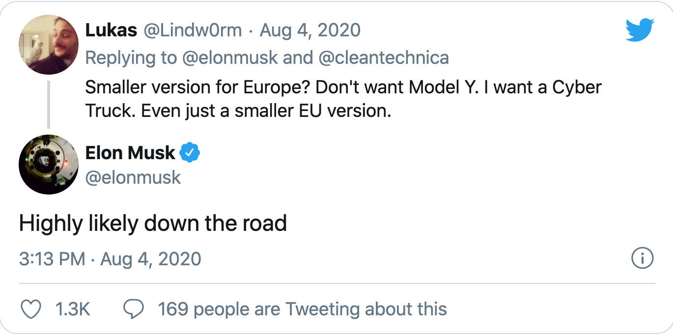 然而马斯克并未完全排除未来生产小尺寸皮卡的可能性。8月3日晚,马斯克在Twitter上表示,特斯拉未来“很有可能”针对欧洲市场推出一款体积较小的皮卡。但是马斯克并未透露将在何时在欧洲市场上推出小尺寸版Cybertruck。当前特斯拉计划从2021年底开始,在奥斯汀超级工厂生产Cybertruck电动皮卡。