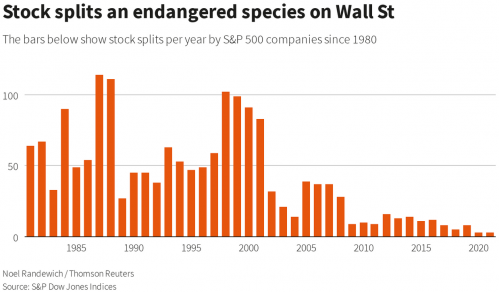 由于股票交易平台可提供零星股份的交易,使个人投资者有机会购买价格偏高的股票,所以拆分股票的做法越来越不普遍。路透社援引标普道琼斯指数数据称,在2020年,只有三名标普500成员宣布分拆,2011年也只有十二名,而在2000年时,这个数字接近一百。