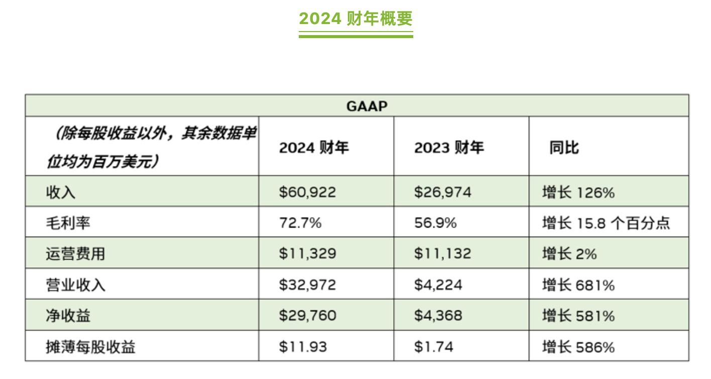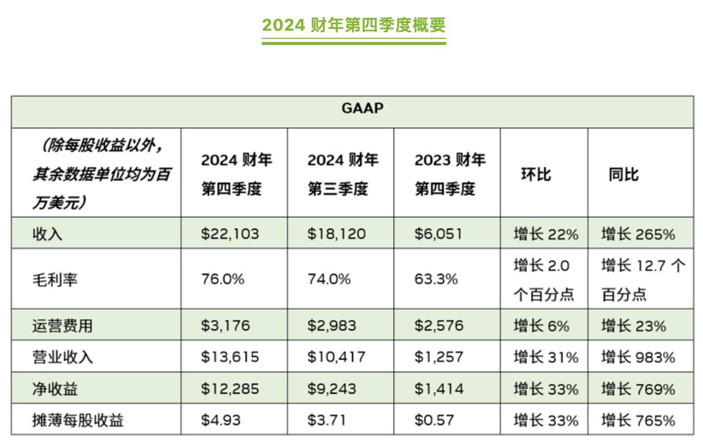 英伟达宣布,截至2024年1月28日的第四季度收入为221亿美元,较上一季度增长22%,较去年同期增长265%。2024财年收入增长126%,达到609亿美元。