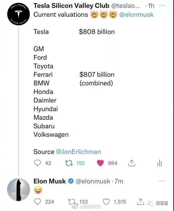 马斯克发推:特斯拉市值已是大众、丰田、通用等11家传统车企之和