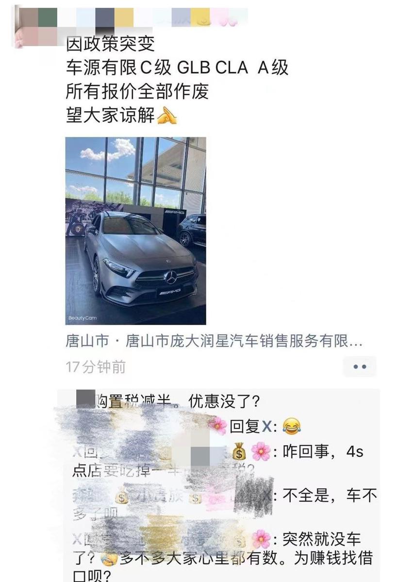 6月1日,网络传出疑似奔驰等经销商,针对购置税减半的政策,对产品价格进行回调,或者原有优惠取消的举动。