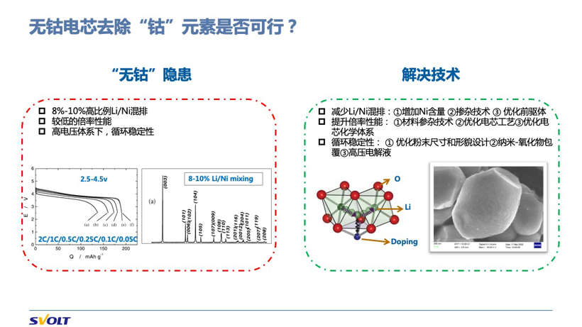 大家都知道要去掉钴,或者把钴减少,但是技术的挑战确实是非常多的。其实没有钴的,高能量密度的电池的理论,在20年前日本的学者就提出来过,但是这么多年来,要不就是大家投入精力少,要么就是技术没有做得很好,没有解决锂镍混排的问题。如果8%-10%锂镍混排不能解决的话,产品稳定性、倍率性都是非常差的。