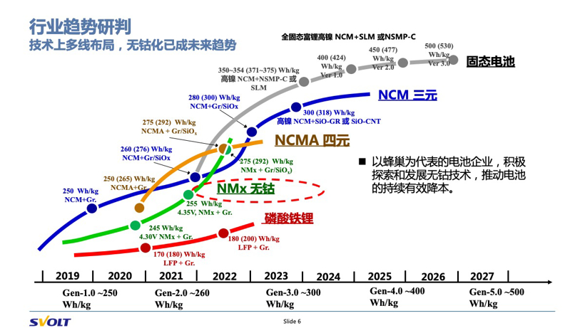 那么这张图是我们公司画的,其实整个行业也差不多。这张图有一个特点,越向上的能量密度越高。另外一个特点是,不管是铁锂、无钴、磷酸铁锂、四元、三元、固态,在能量密度提高的同时,钴的含量都在想办法向下降。从最早的111到523,到6系7系8系,现在NCMA和NCL做到9系的,镍的含量一直在上升,钴的含量一直在下降,人类在追求去钴化和无钴化上的努力,一直在做各种各样的功课,从来没有停止过。