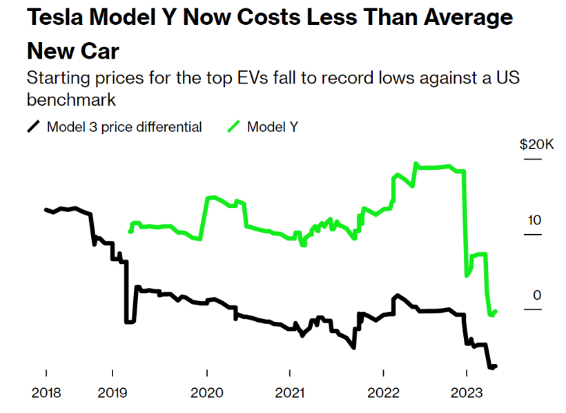 特斯拉车辆最低价与美国新车平均交易价格的差距;图片来源:彭博社