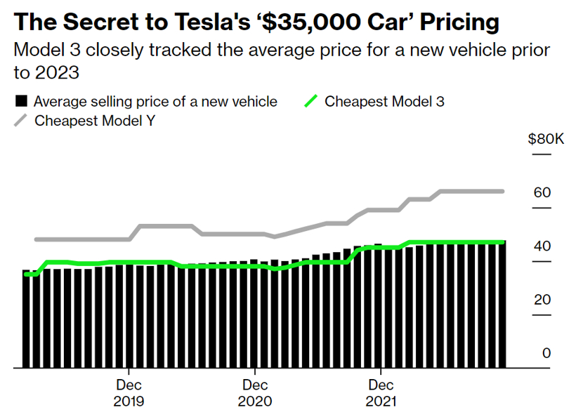 当这款轿车在2017年投入生产时,马斯克宣称它的价格为3.5万美元,几乎完全反映了当时美国新车的平均价格34,944美元。在经历一段时间的通货膨胀后,Model 3在今年1月初的起售价为46,990美元,而美国的新车平均价格为47,681美元。