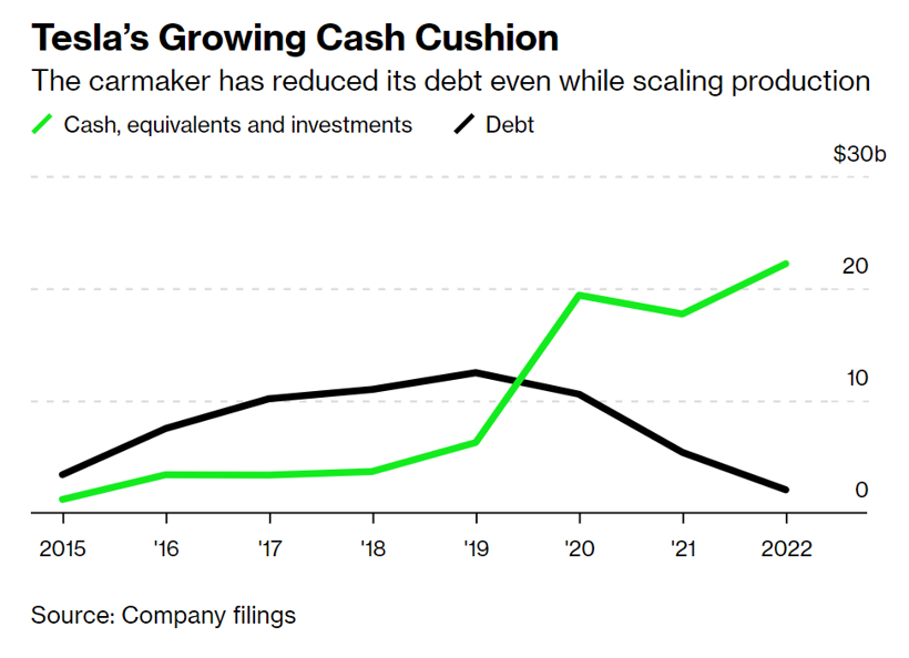 特斯拉现金储备不断增长,债务不断下降;图片来源:彭博社