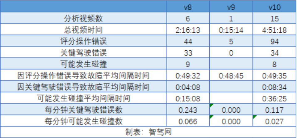 以上为黎明计划分析的视频数据。从表中可看出,特斯拉FSD在城市街道上平均每8分钟发生一次关键驾驶错误。