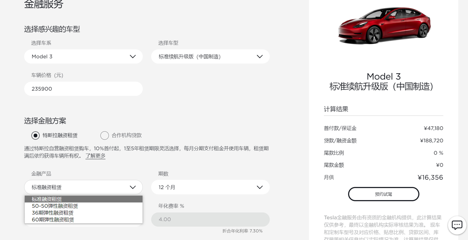 11月4日,特斯拉中国官网购车金融方案发生改变,已于11月1日上线的融资租赁0首付选项被取消,目前选择特斯拉融资租赁方案购车,最低首付为10%起。