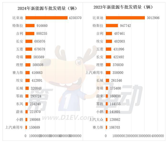 2024年最畅销新能源车企TOP15:特斯拉首次同比下滑,奇瑞翻倍暴涨超越理想