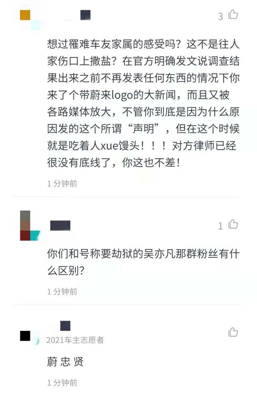 有车主表示,“蔚来用户已经超过10万人,这几百人不能代表广大蔚来车主。”也有车主认为这是在给蔚来帮倒忙。甚至有些车主在蔚来APP上谴责对方消费死者,吃“人血馒头”。
