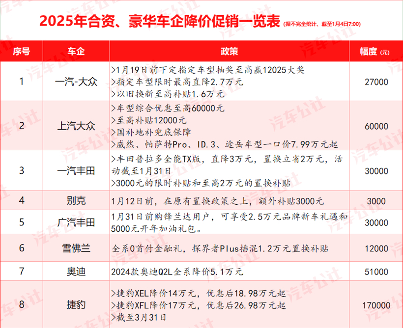 从降价和优惠力度来看,一汽-大众、上汽大众、一汽丰田普拉多、奥迪等,动不动三五万的现金直降,促销力度极为可观。甚至二线豪华品牌捷豹,最高降幅竟然达到17万元,用原本合资B级车的价格就能开走一台豪华车。