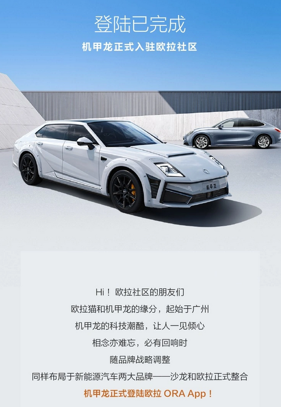 3月22日,长城汽车宣布旗下两家新能源品牌欧拉与沙龙正式整合,长城沙龙旗下车型机甲龙已入驻欧拉社区,将在欧拉App中显示,机甲龙专区也在该App一同上线。