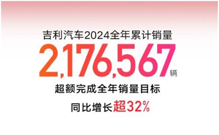 吉利2024年总销量达2176567辆,同比增长超32%,超额完成全年销量200万目标,同样创下年销量历史新高。过去一年是吉利新能源全面爆发的一年,旗下吉利、领克、极氪三大品牌12月销量达到111206辆,同比增长93%,渗透率连续五个月突破50%,并推动其新能源全年销量至888235辆,同比增长约92%。