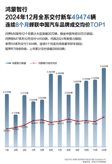 2024年,鸿蒙智行全年累计交付444956辆,稳坐中国车市成交均价TOP1;12月单月交付49474台,创月交付量新高。全景智慧旗舰SUV问界M9发布12个月累计大定突破20万辆,连续9个月蝉联中国市场50万以上月度销冠。享界S9系列交付7494辆,连续5个月成为40万以上纯电豪华轿车销冠。国民SUV问界新M7系列12月交付14150辆,年度累计交付新车19.7万辆,荣获2024年新势力车型年度销冠。智慧轿跑SUV智界R7累计交付28969辆。