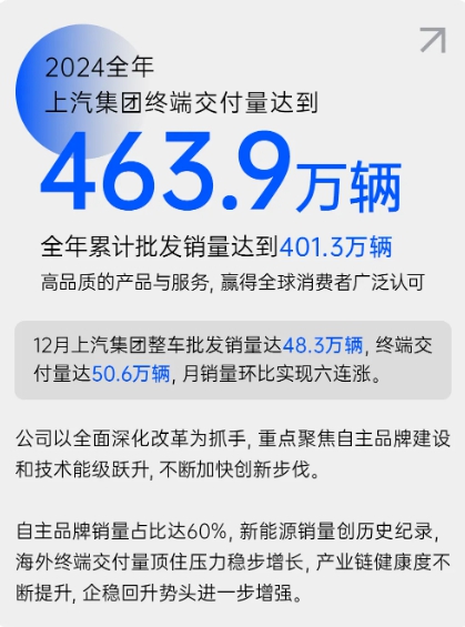 上汽集团2024年累计交付463.9万辆,批发401.3万辆。其中,自主品牌销售240.8万辆,占比60%,同比提升5个百分点;新能源销量123.4万辆,同比增长9.9%;海外交付108.2万辆,同比增长2.6%。旗下上汽通用五菱总销量达1,540,077辆,其中新能源销量达80万辆,占比超50%,同比增长63%;海外出口22.5万辆/套,刷新历史记录。
