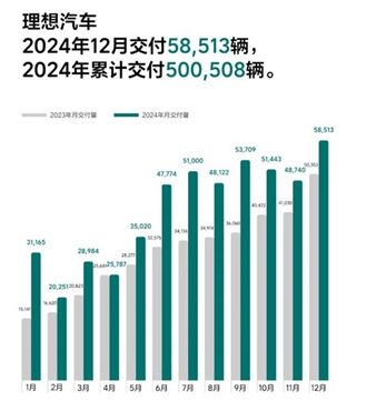 造车新势力品牌之中,理想汽车2024年12月交付新车58513辆,同比增长16.2%。去年全年,理想汽车共交付500508辆,历史累计交付量为1133872辆。