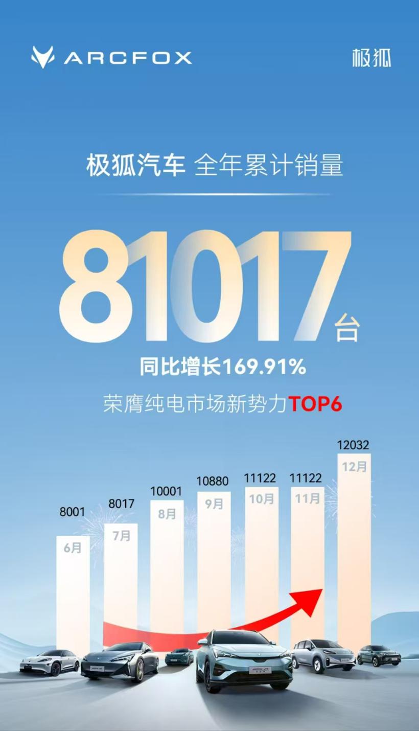 此外,北汽新能源旗下极狐品牌2024年累计销量达成81017台,同比增长169.91%,连续3年实现销量翻番,并成为纯电市场新势力TOP6。具体来看,极狐阿尔法S5全年交付2.17万辆,阿尔法T5全年交付3.71万辆,极狐考拉全年交付1.93万辆。