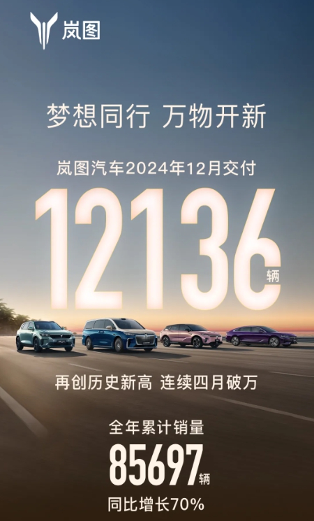 东风旗下岚图汽车12月交付12,136辆,连续四个月破万辆;2024全年累计销售85,697辆,同比增长70%。