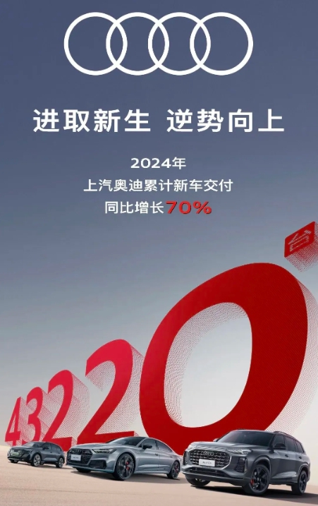 豪华车方面,一汽奥迪宣布2024年全年累计实现整车销售611088辆,其中国产燃油车550136辆,时隔四年市场份额重回国产燃油豪华车领域第一。其中,奥迪A6L全年销量17.7万辆;奥迪Q5L年销14.9万辆,细分市场份额超过26%;奥迪A3家族与Q3家族全年销量达到9.9万辆,市场份额突破32%。此外,上汽奥迪2024年累计新车交付43,220辆,同比增长70%。