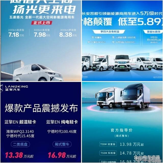 紧接着,一众车企的新品价格走低:蓝擎汽车推出的超混轻卡二类底盘13.38万元起售,纯电轻卡整车16.98万元起;上汽通用五菱旗下五菱扬光,官方售价7.18万元-8.38万元;长安凯程的产品价格低至5.89万元。